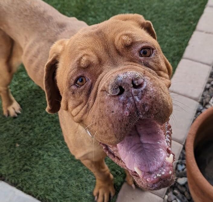 We picked Carolina up from a Tucson shelter in early April of 2023. The shelter believed Caroline was about six years old, she had been used for breeding and came to the shelter with a running nose and swelling on her left hind foot. She had severe bridging spondylosis throughout thoracic and lumbar spine. She was severely underweight – at just 80 pounds and had a body score of 3/9. She also had a distended stomach, bleed when she sneezed and was stiff moving.