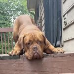Star and two other Dogue de Bordeaux lived outside. No dog house or kennel, just outside. Having only lived outdoors it was challenging to transition to living indoors and being part of a family. She has learned to walk on a leash and is crate and house trained. Star does not do well with other dogs. We do not know how she is with cats or small children. Star has anxiety and we have been working on her resource guarding.