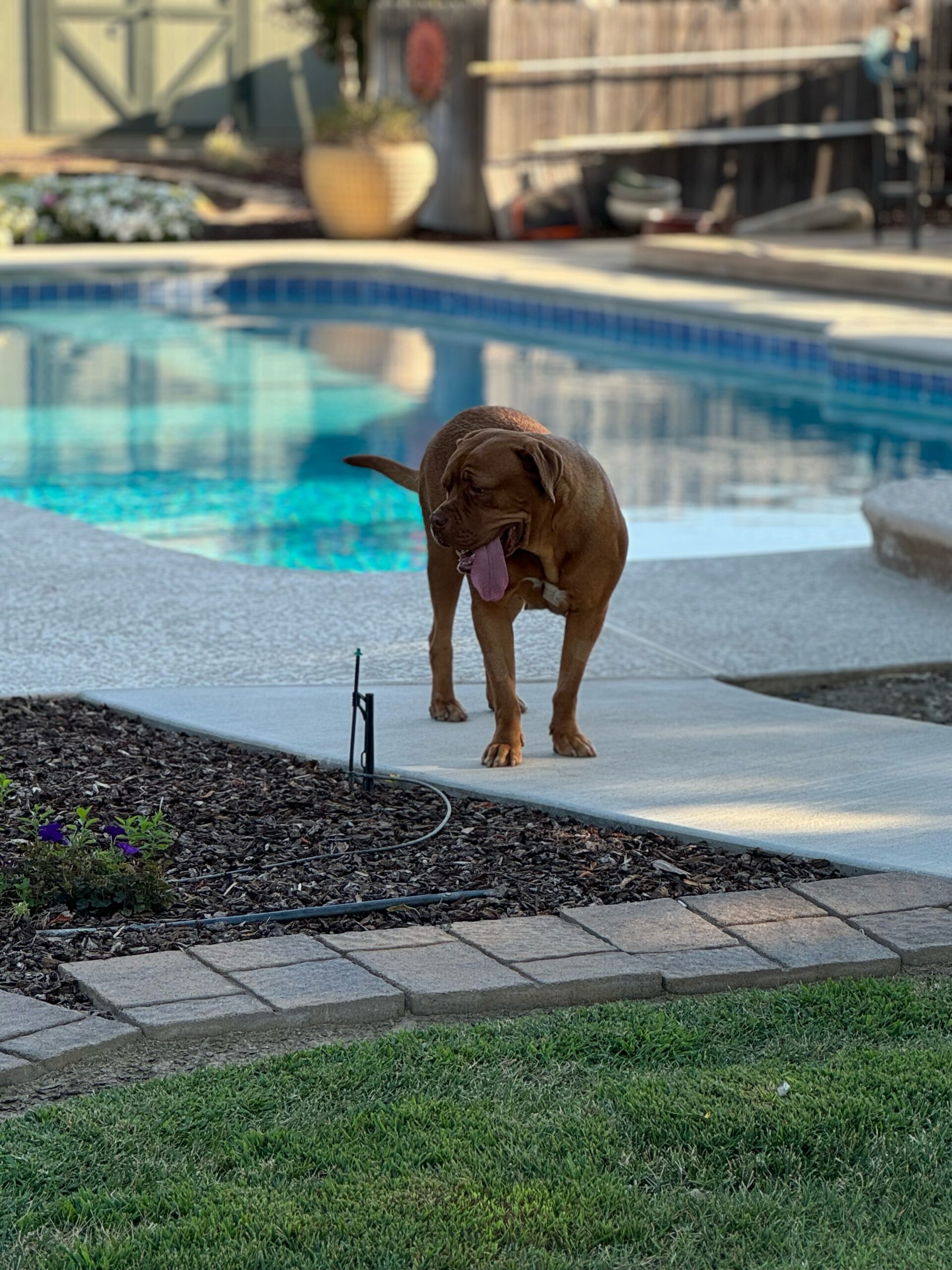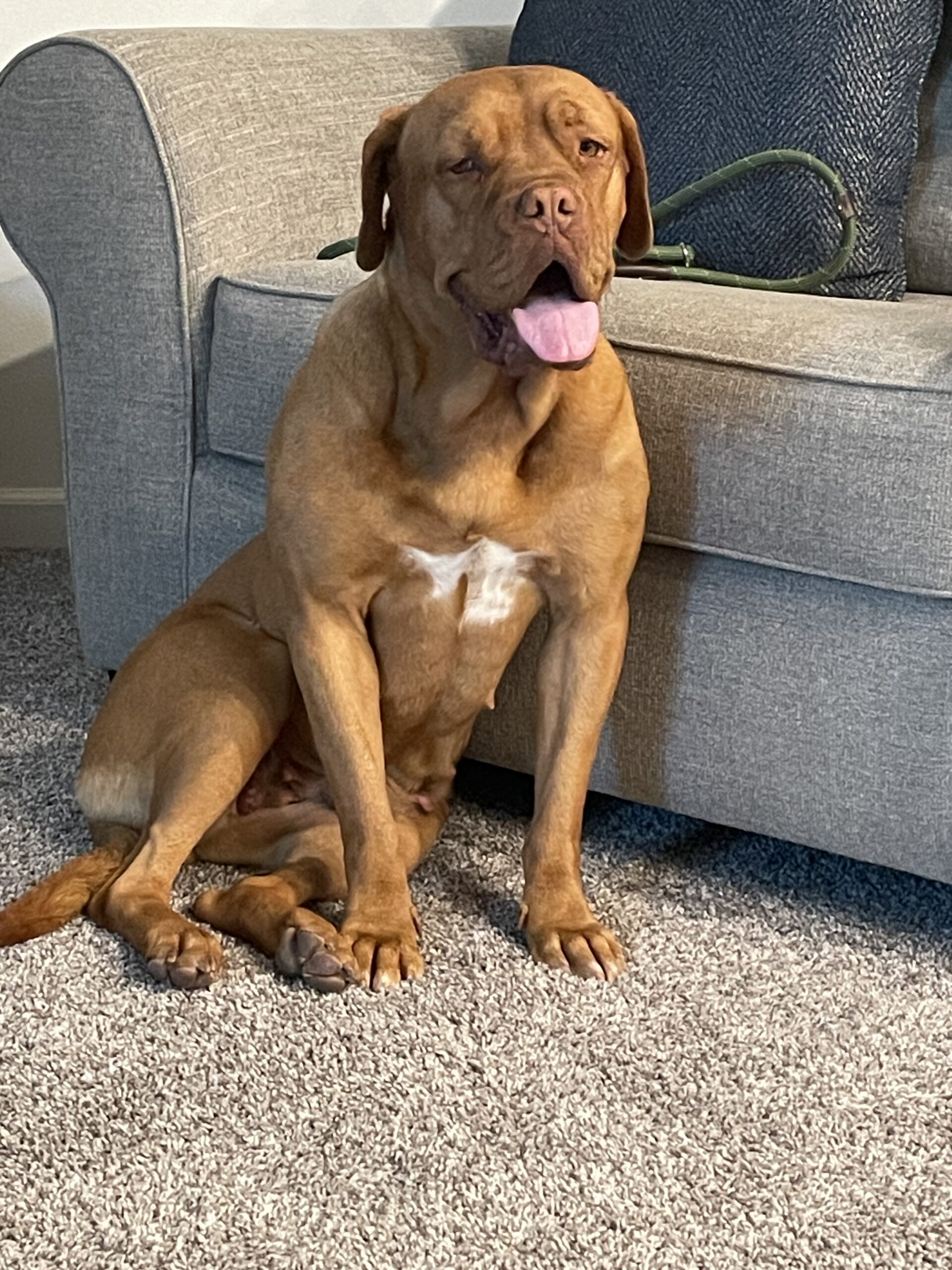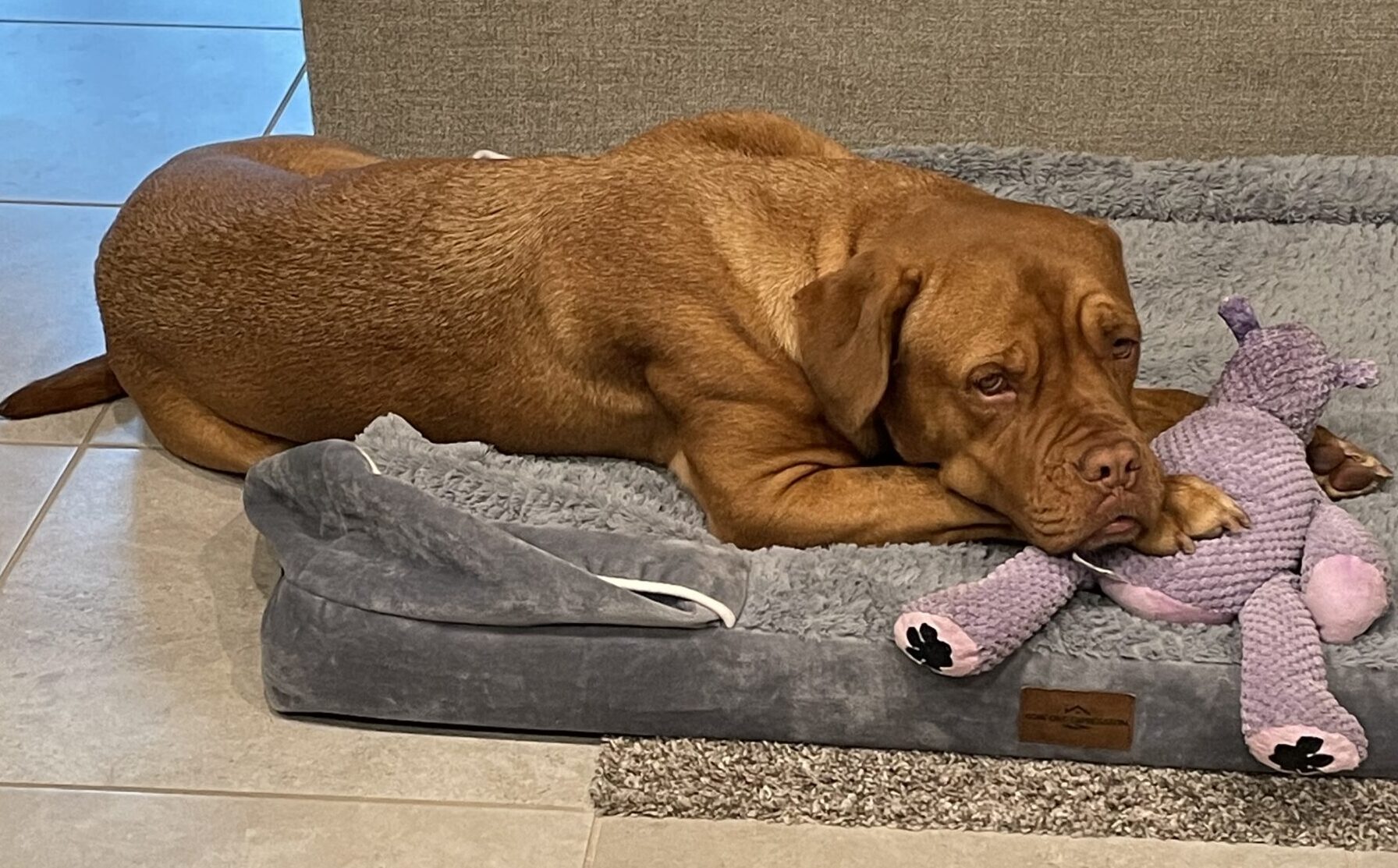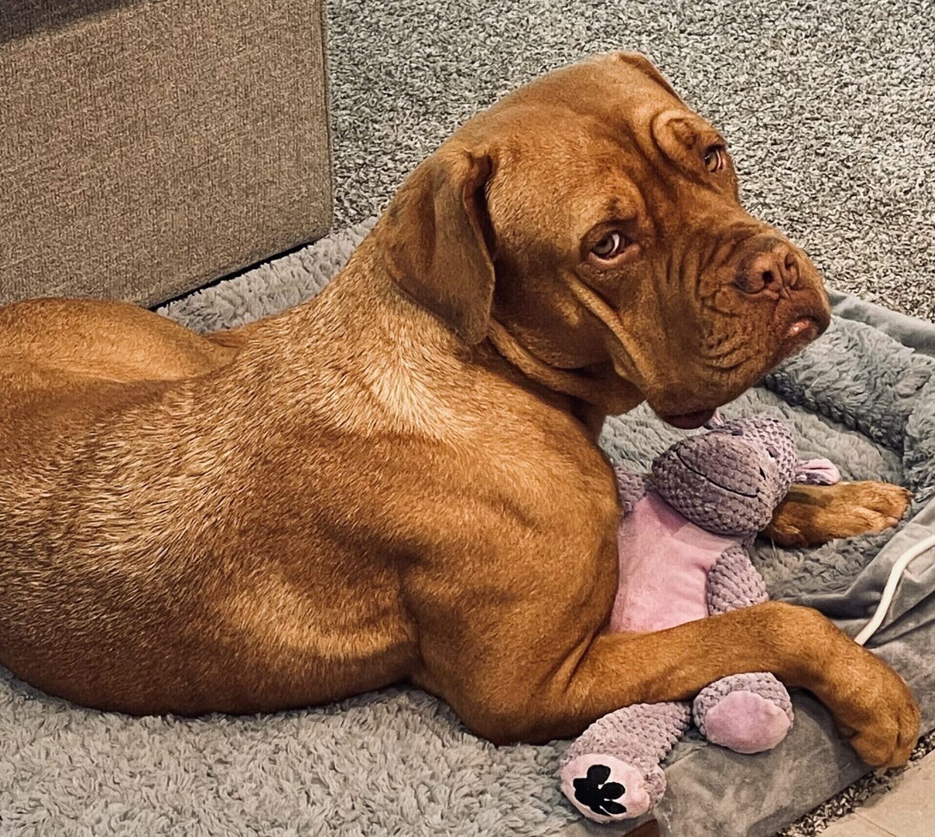 Willow likes to play with toys, stroll through the local Lowe’s but is your basic couch potato Bordeaux. She likes to lay in the sun.